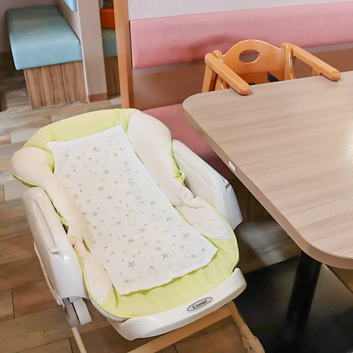 キッズチェアは椅子につけるタイプをご用意。バウンサーも空いていればお貸しいたします。