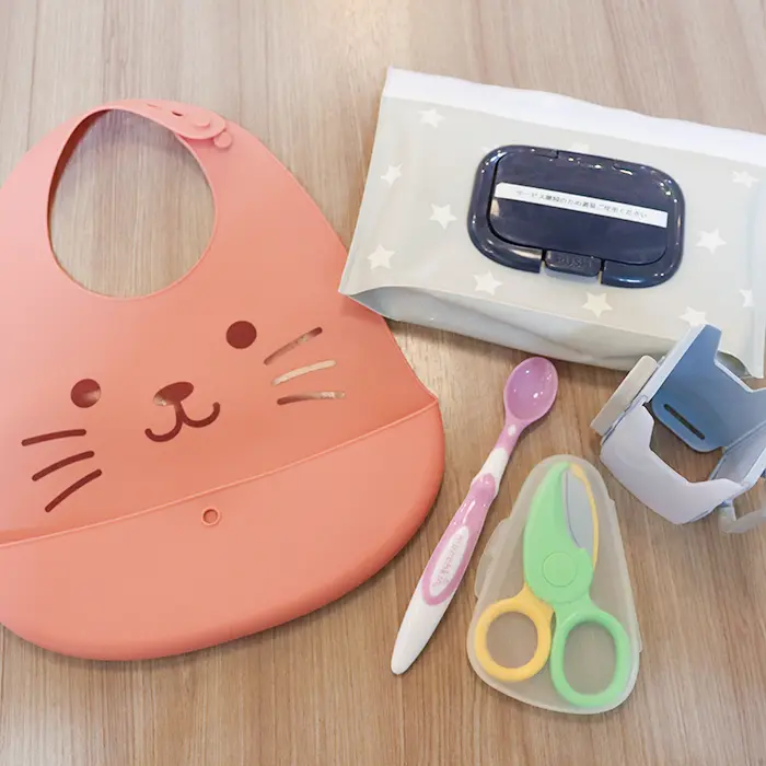 食事エプロン、離乳食スプーン、麺カッター、ジュースホルダー、手口拭きは無料貸し出しいたします。