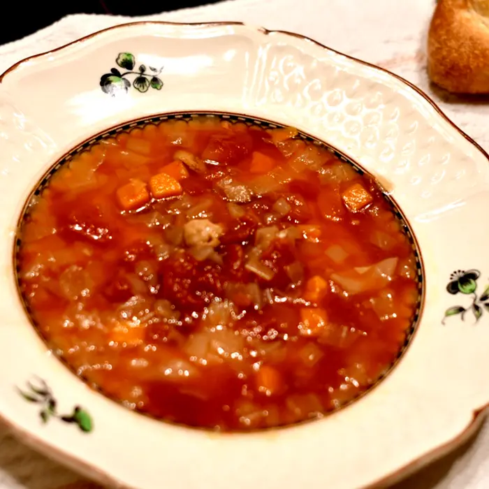 抗生物質・合成抗菌剤不使用の国産牛豚合挽き肉に多量のたまねぎと豆腐を加えたふっくらヘルシーな特製ハンバーグ。ゴロゴロ野菜のトマトソースでさっぱりとお召し上がりください。