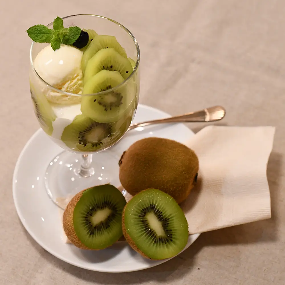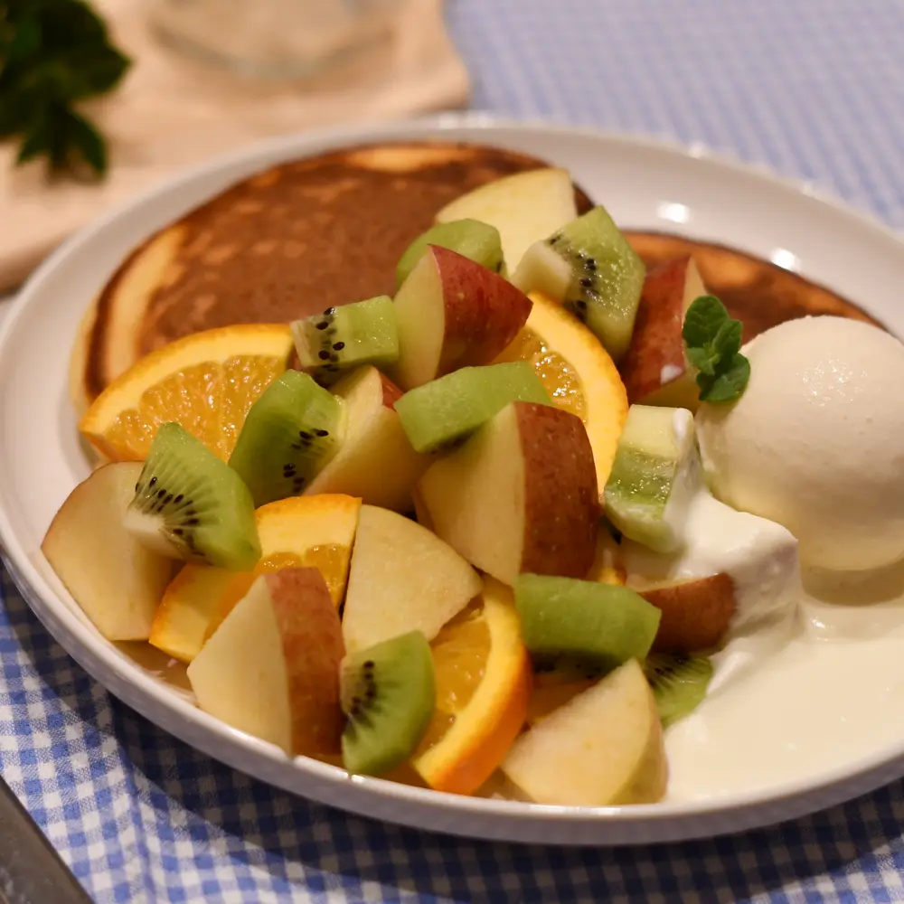 北海道産小麦使用のほかほかパンケーキに、国産フルーツと無添加バニラアイスを添えて。パンケーキの優しい甘味とフルーツの酸味がベストマッチ。