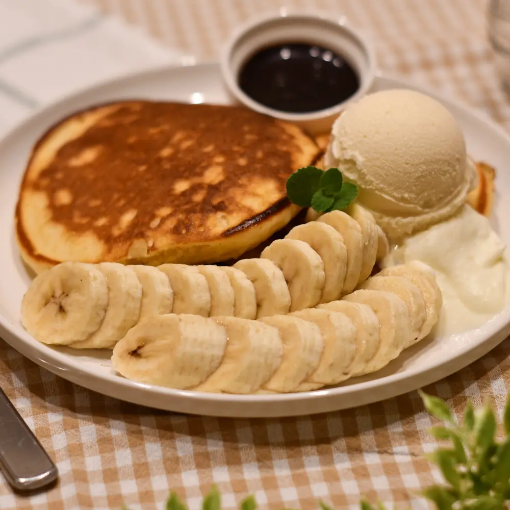 北海道産小麦使用のほかほかパンケーキに、オーガニックバナナと無添加バニラアイス、無添加・オーガニックのココアソースを添えて。