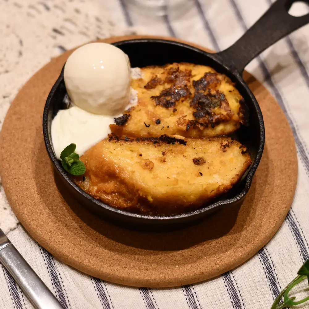 添加物不使用・天然酵母使用のバゲットにたっぷり牛乳と卵を染み込ませました。バニラアイスと生クリームとの相性も抜群♥