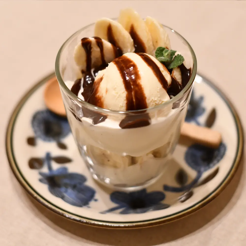 バナナまるごと1本に、無添加バニラアイス、無添加のオーガニックココアソースがかかった、こだわりのチョコバナナパフェ。これぞ王道♥