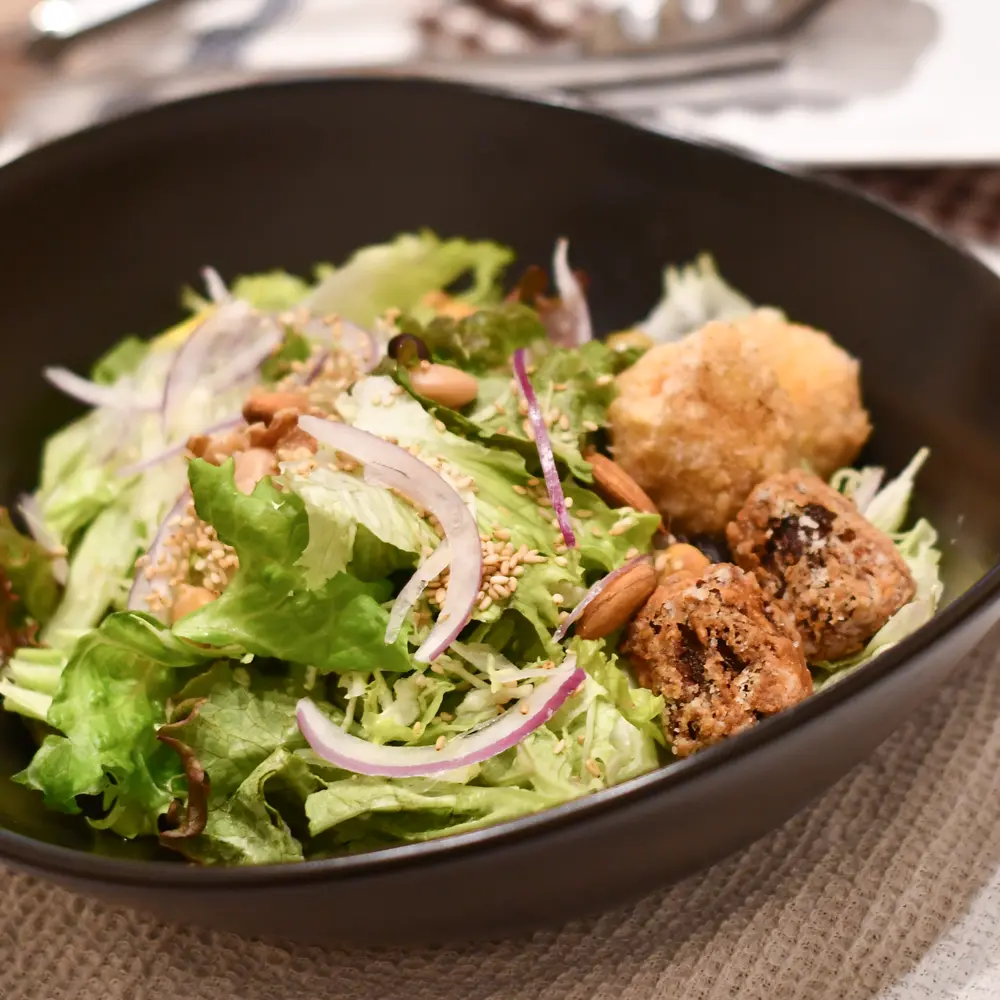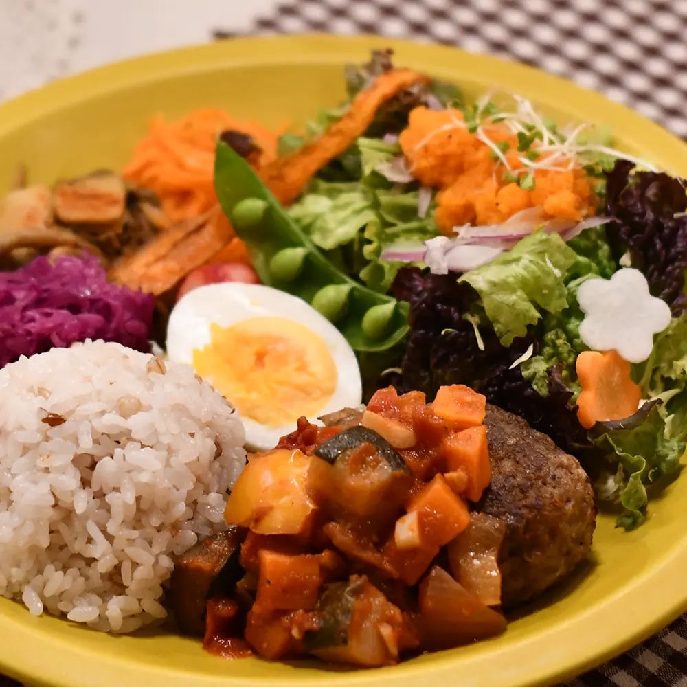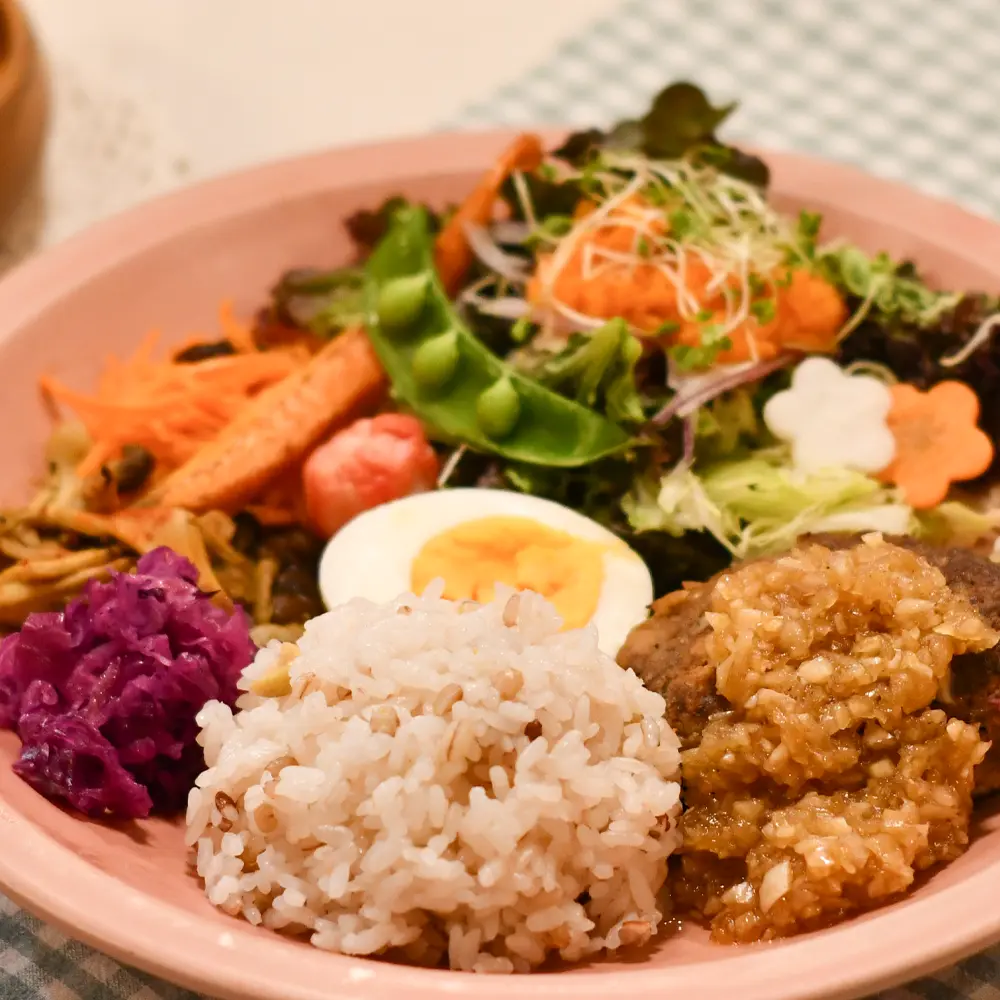 たっぷりの野菜やナッツ類に、大豆ミートを使用した唐揚げ、ファラフェル(ひよこ豆を使って作られたコロッケ)も乗って、食べ応えも満点。肉や魚を使用しておらず、ヴィーガンの方にもおすすめです。