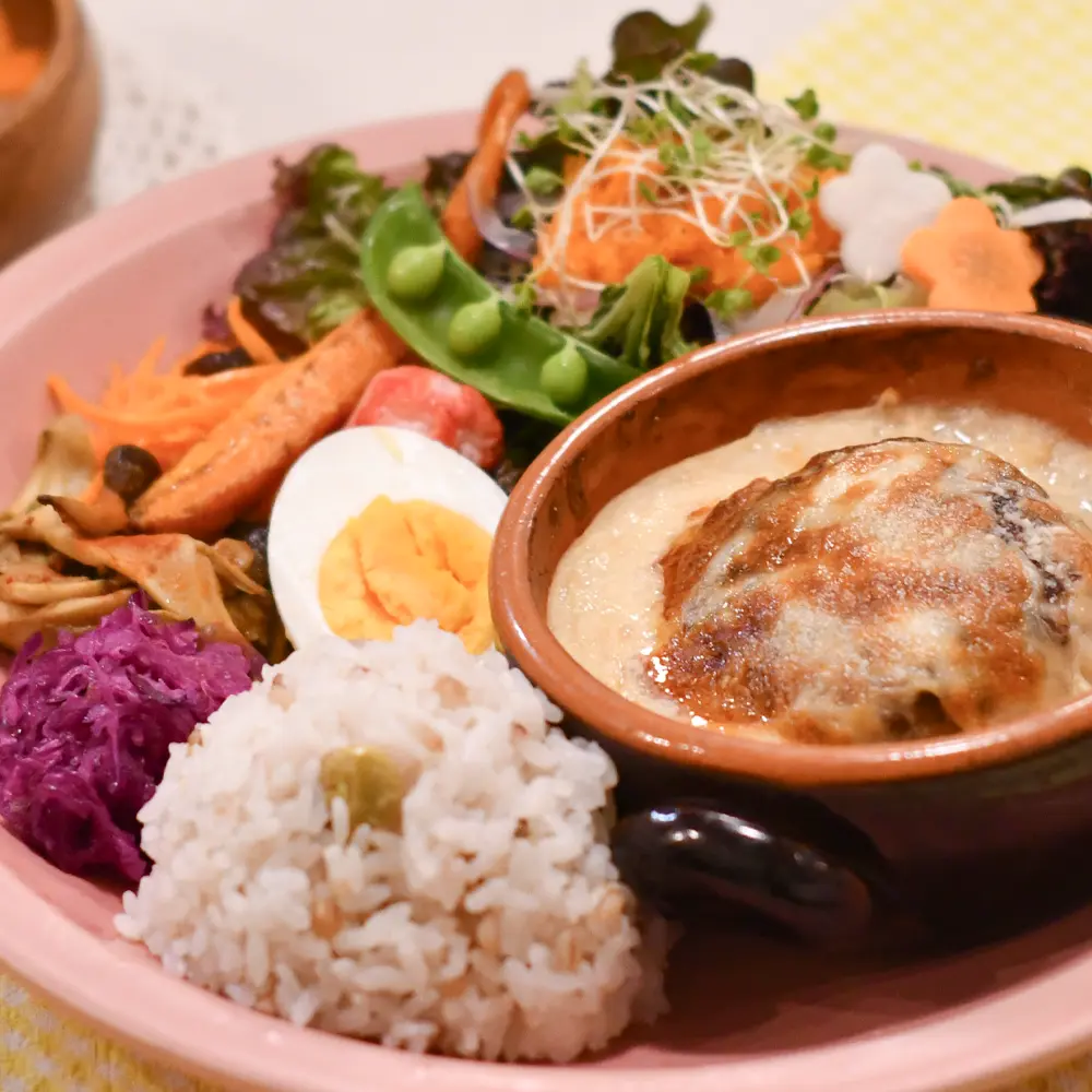 当店自慢のふっくらやわらかハンバーグと、グルテンフリーのホワイトソースがコラボした贅沢な一皿。添加物不使用のナチュラルチーズとの相性も抜群です。