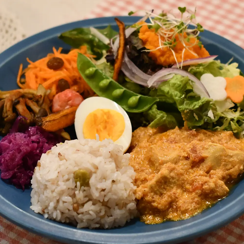 バターの使用量を抑え、有機豆乳で仕立てたトマト感たっぷりのヘルシーカレー。甘口なのでお子様とのシェアもおすすめです。