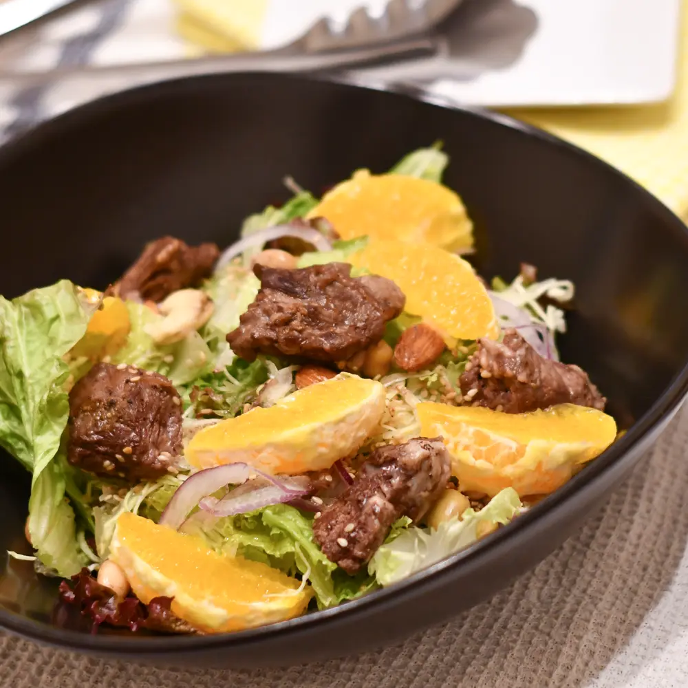 成長促進ホルモン剤や抗生物質等不使用でニュージーランドで完全放牧で育てられたグラスフェッドビーフ使用。脂身の少ないハラミ肉とジューシーなオーガニックオレンジに、シンプルなガーリック醤油ドレッシングが相性抜群。