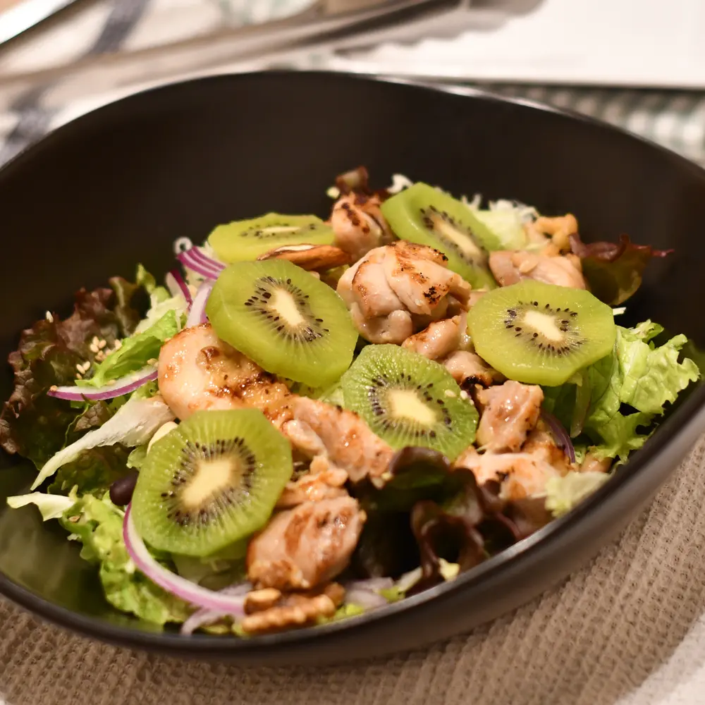 抗生物質・合成抗菌剤不使用で育てられた県産ブランド鶏「赤城鶏」使用。自家製塩麹に漬け込んだジューシーなチキンと酸味のあるオーガニックキウイが相性抜群。甘酸っぱいハニーマスタードドレッシングがベストマッチです。