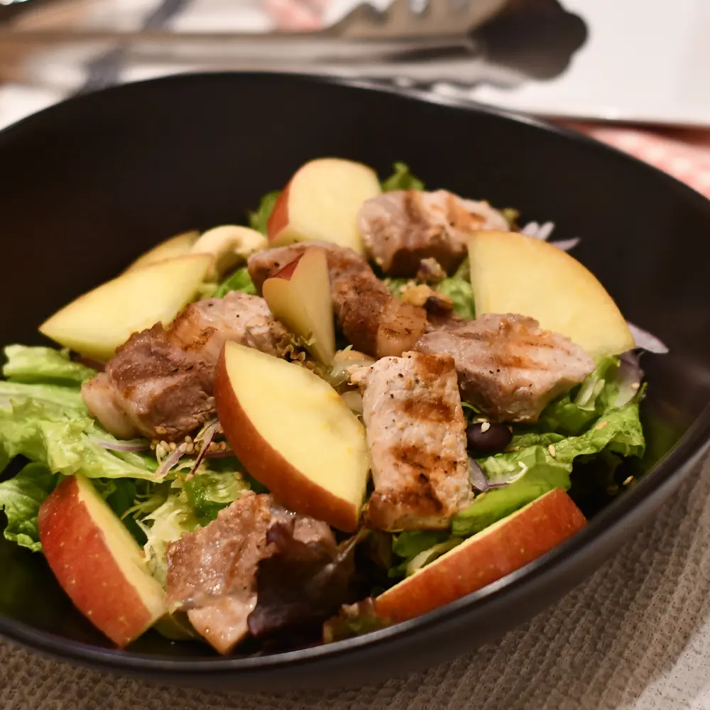抗生物質・合成抗菌剤不使用で育てられた県産ブランド豚「上州もち豚」使用。さっぱりとしたりんごとにんじんドレッシングとの相性抜群です。 -