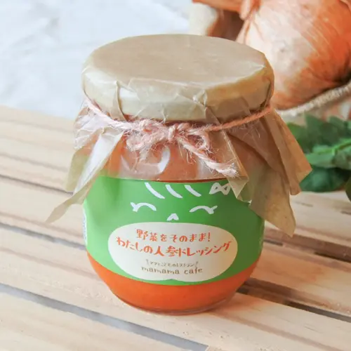 すりおろしのオーガニック生にんじんと無添加の調味料のみでつくった自家製ドレッシング 。リンゴ酢を加えているので、人参の臭みは抑えつつ甘酸っぱい仕上がりに。サラダにはもちろん、お刺身にかけてカルパッチョにも♪