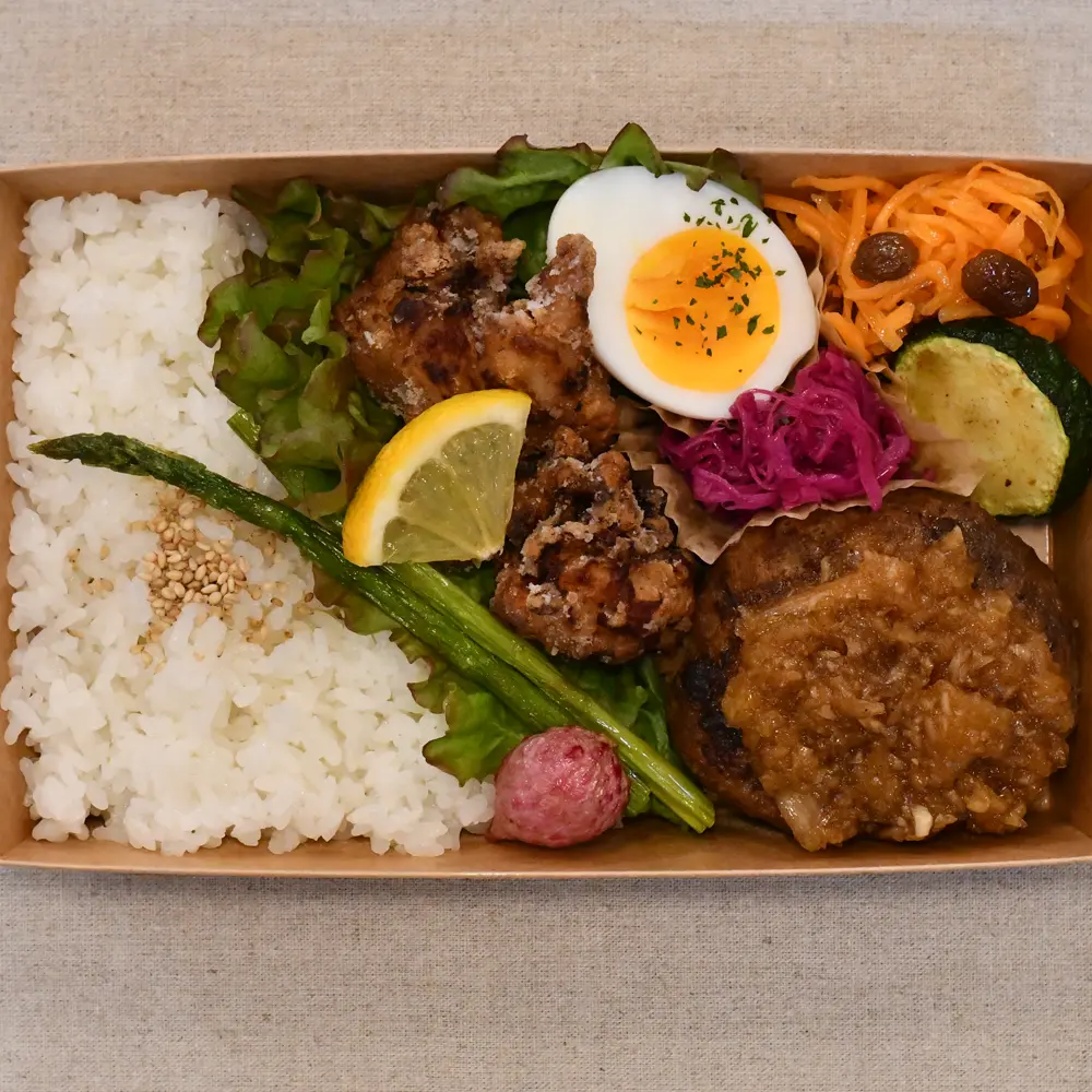 群馬県産自然栽培米ひとめぼれ180g(現在は京都府産特別栽培米こしひかり)、旬のオーガニック野菜の副菜2種、旬のオーガニック素揚げ野菜2.3種、味付き卵、手ごねハンバーグ玉ねぎソース、赤城鶏唐揚げ2個