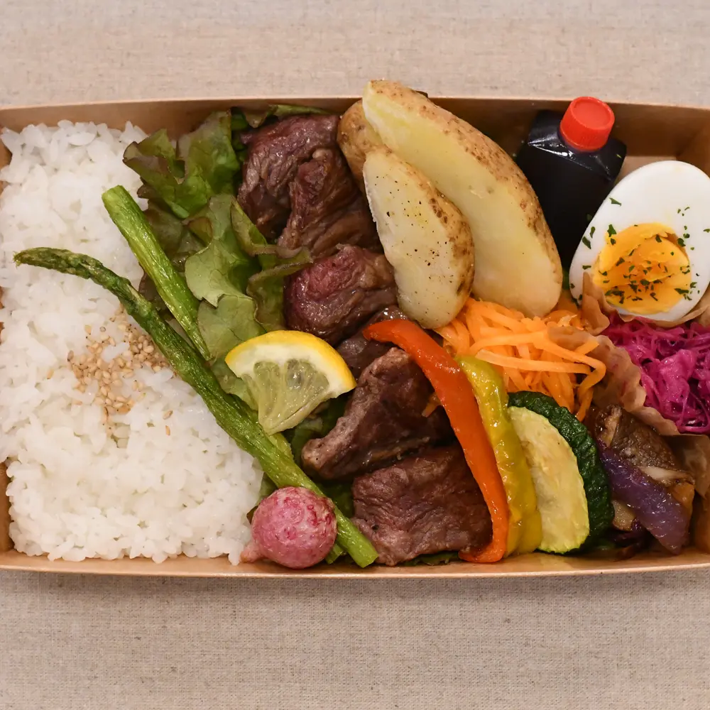 群馬県産自然栽培米ひとめぼれ180g(現在は京都府産特別栽培米こしひかり)、旬のオーガニック野菜の副菜3種、旬のオーガニック素揚げ野菜2.3種、味付き卵、ニュージーランド産グラスフェッドビーフ、ガーリックしょうゆソース、有機フライドポテト