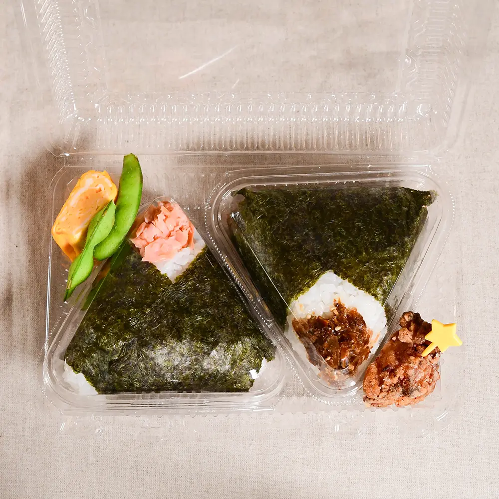 群馬県産自然栽培米ひとめぼれ180g(現在は京都府産特別栽培米こしひかり)、旬のオーガニック野菜の副菜2種、旬のオーガニック素揚げ野菜2.3種、味付き卵、赤城鶏唐揚げ2個、ミニカレーコロッケ2個