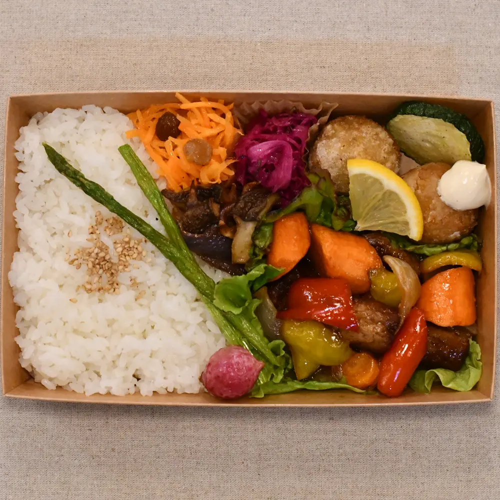群馬県産自然栽培米ひとめぼれ180g(現在は京都府産特別栽培米こしひかり)、旬のオーガニック野菜の副菜3種、旬のオーガニック素揚げ野菜2.3種、ヴィーガン唐揚げの酢鶏風、ファラフェル2個、ニンニクマヨソース