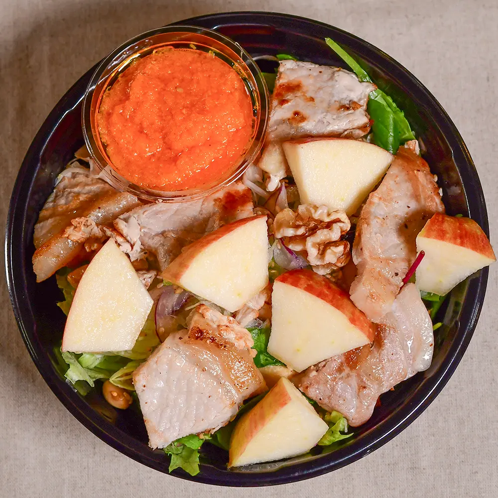 抗生物質・合成抗菌剤不使用で育てられた県産ブランド豚「上州もち豚」使用。さっぱりとしたりんごとにんじんドレッシングとの相性抜群です。