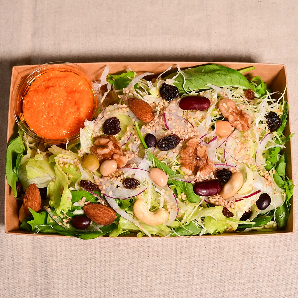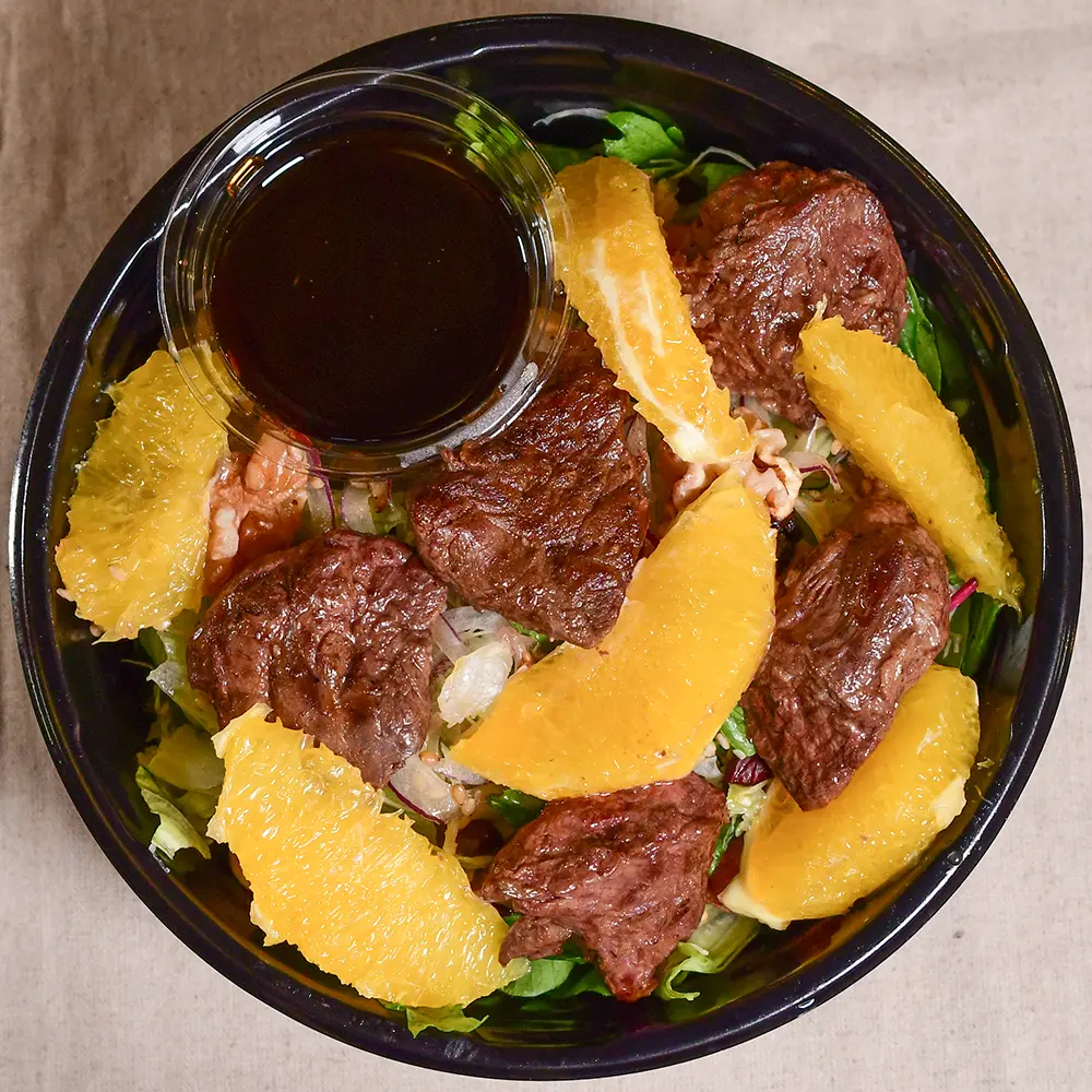 成長促進ホルモン剤や抗生物質等不使用でニュージーランドで完全放牧で育てられたグラスフェッドビーフ使用。脂身の少ないハラミ肉とジューシーなオーガニックオレンジに、シンプルなガーリック醤油ドレッシングが相性抜群。 -