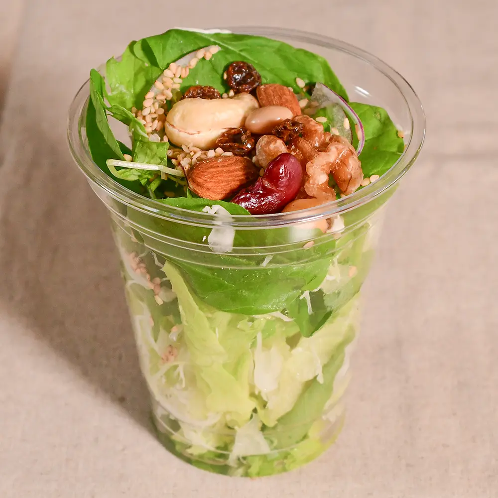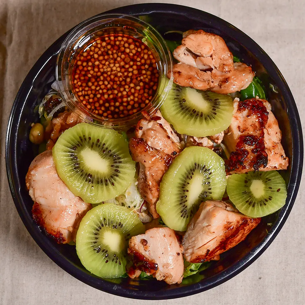 抗生物質・合成抗菌剤不使用で育てられた県産ブランド鶏「赤城鶏」使用。自家製塩麹に漬け込んだジューシーなチキンと酸味のあるオーガニックキウイが相性抜群。甘酸っぱいハニーマスタードドレッシングがベストマッチです。